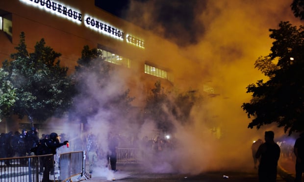 A chaotic scene erupted outside a Donald Trump rally in New Mexico Tuesday night.Throngs of protesters gathered outside the rally in Albuquerque and several protesters were escorted out of the rally earlier. At one point, protesters broke through a barricade erected by police, rushing the convention center where Trump was speaking.